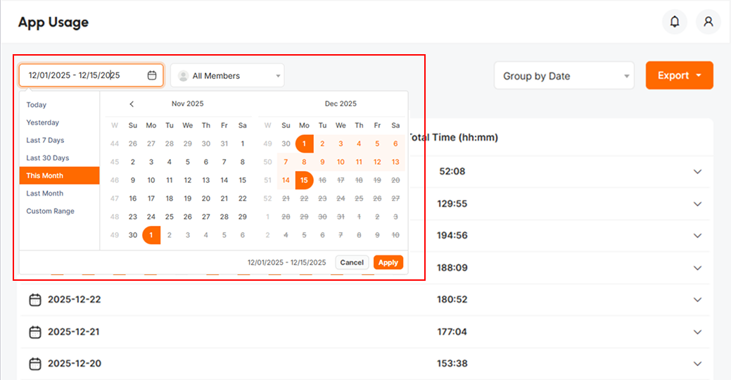 You can select a specific date range to view app usage data for a defined period. This allows you to analyze short-term behavior (such as a single day or week) or longer trends across weeks or months. Once the date range is updated, all usage calculations - total time, grouping, and exports - are refreshed automatically.