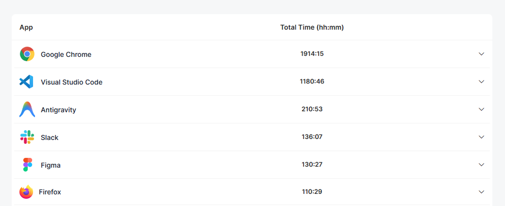 The App Usage page provides a clear and structured view of how applications are used across your organization during tracked work time. This page helps you understand which apps are being used, by whom, and for how long, enabling better visibility into productivity patterns, work habits, and tool utilization.