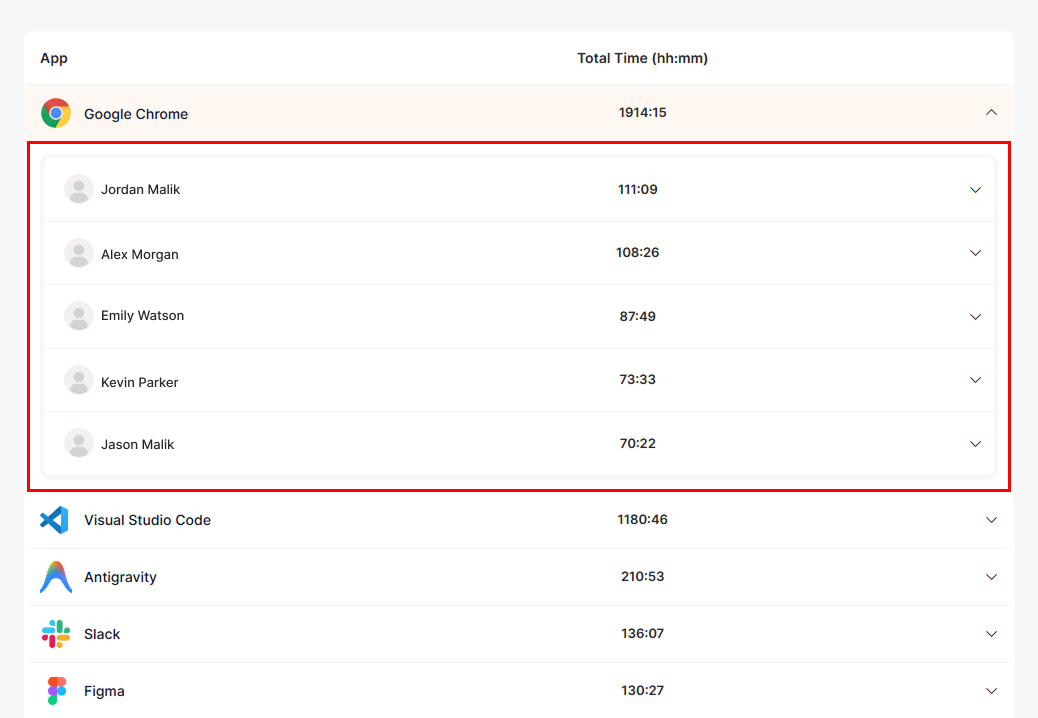 The Group by Member view reorganizes App Usage data around individual team members, making it easy to understand how each person spends their time across different applications and dates. This perspective is especially useful for performance reviews, workload analysis, and identifying usage patterns at an individual level.