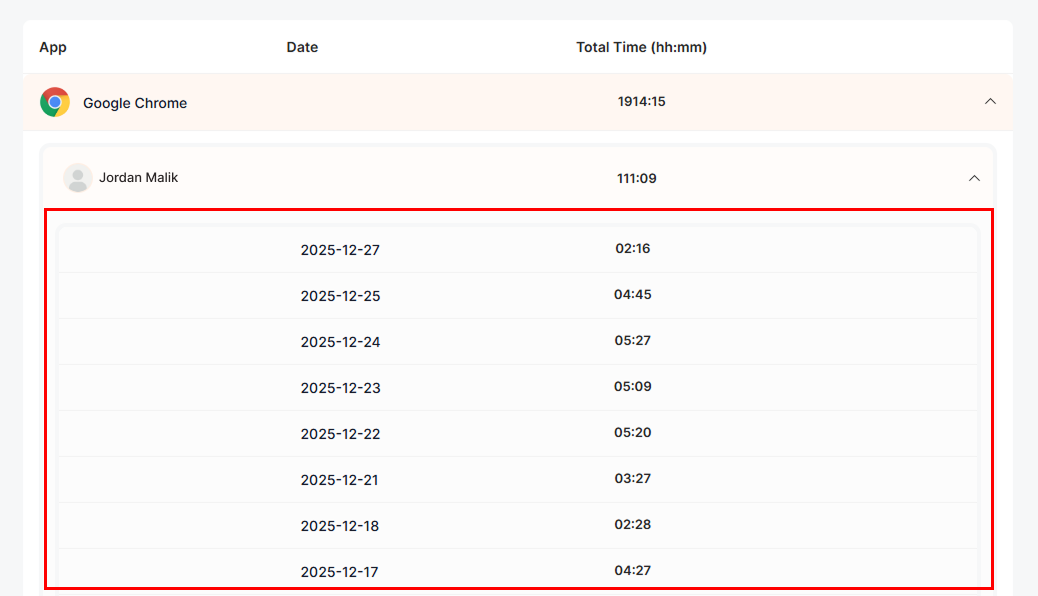 When Group by Date is selected, the App Usage list presents application usage in a clear, time-based hierarchy. This view is designed to help you understand which apps were used on a specific day and who used them, along with the total time spent.