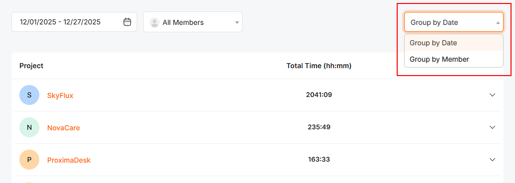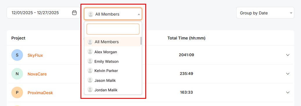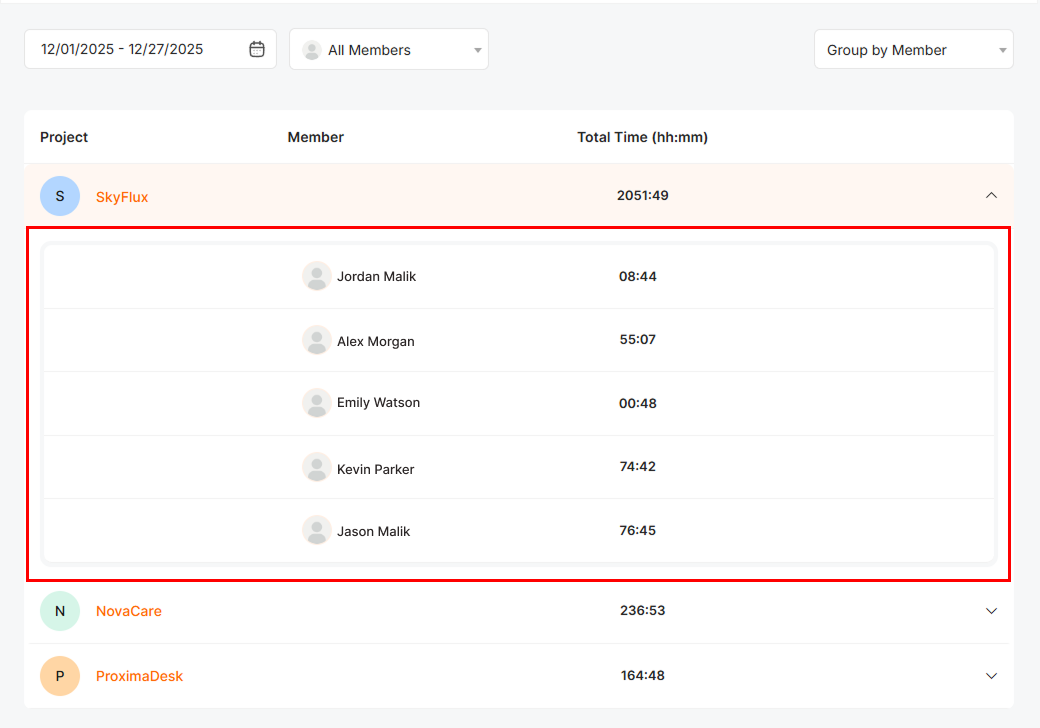 When Group by Member is selected on the Project Timing page, the list reorganizes the data to focus on who worked, instead of when the work happened. This view is especially useful for evaluating individual contributions across different projects.